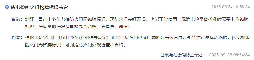 您好,目前十多年老楼防火门无铭牌标识,现防火门完好无损、功能正常使用,现消电检平台检测时需要上传铭牌标识,请问类似情况消电检是否合格,请指导,谢谢!