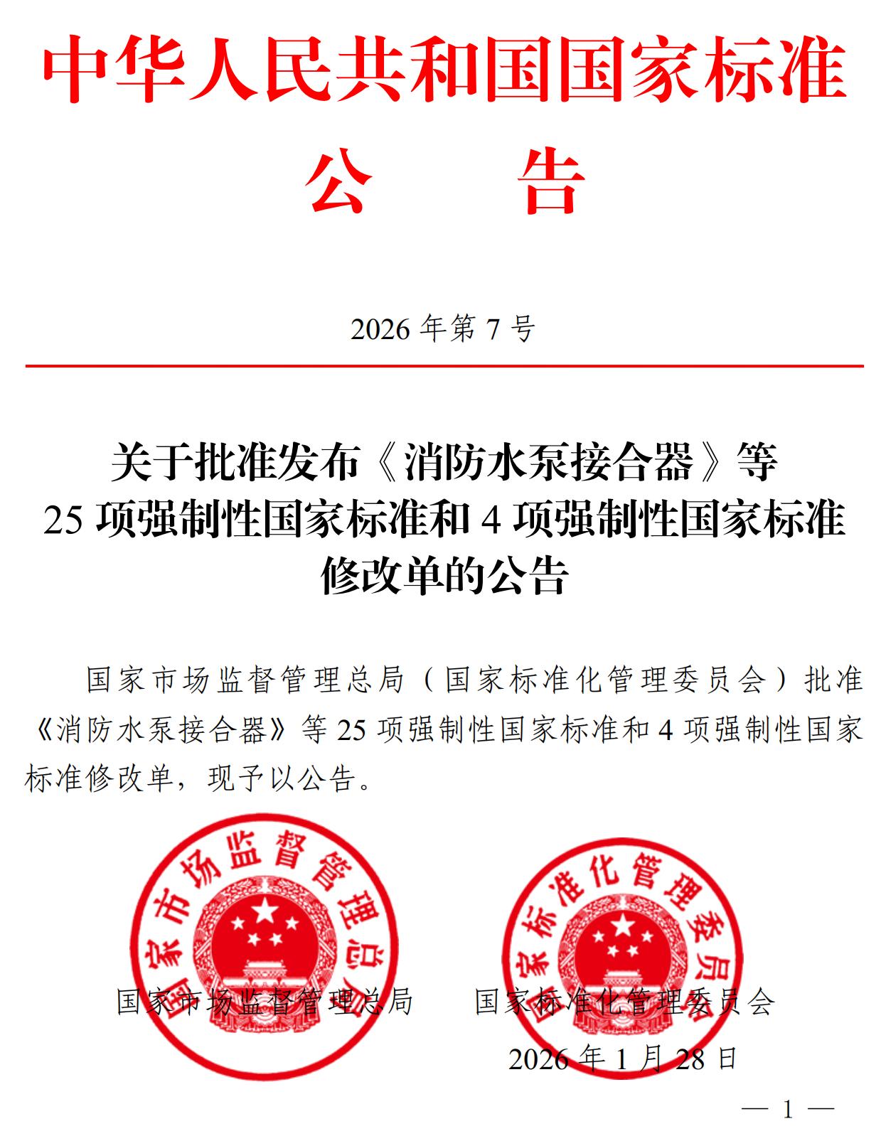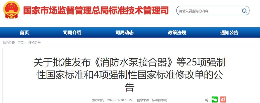 国家市场监督管理总局(国家标准化管理委员会)批准《消防水泵接合器》等25项强制性国家标准和4项强制性国家标准修改单,现予以公告。
