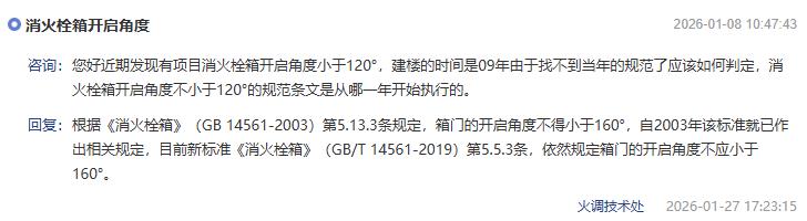 您好近期发现有项目消火栓箱开启角度小于120°,建楼的时间是09年由于找不到当年的规范了应该如何判定,消火栓箱开启角度不小于120°的规范条文是从哪一年开始执行的。