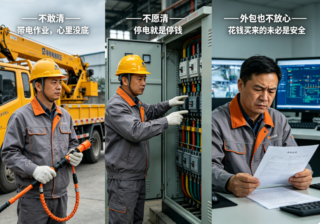 不少企业选择外包,想着“花钱买平安”。但现实中,外包服务良莠不齐:有的清理不干净,只清表面,内部死角依旧藏灰;有的操作不专业,喷枪角度、压力不当,可能冲松接线端子、损坏精密元件;有的外包方没有带电作业资质,设备也无绝缘认证;更有甚者,使用劣质或非专用清洗剂,腐蚀设备金属部件、加速绝缘老化。