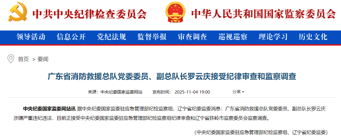 据中央纪委国家监委驻应急管理部纪检监察组、辽宁省纪委监委消息:广东省消防救援总队党委委员、副总队长罗云庆涉嫌严重违纪违法,目前正接受中央纪委国家监委驻应急管理部纪检监察组纪律审查和辽宁省铁岭市监察委员会监察调查。