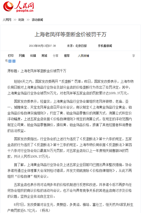 2013年,上海黄金饰品行业协会组织老凤祥、老庙等五家金店,通过制定《价格自律细则》统一金价浮动范围,最终被国家发改委处以总计超千万的罚款。店员口中“协会制定的指导价”,成了最直接的垄断证据。