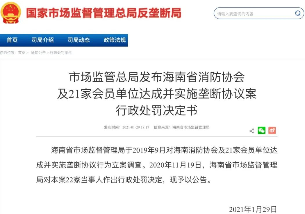 2023年,海南省消防协会组织21家会员单位达成《最低自律价决议》,被海南省市场监督管理局处以近948万元的罚没款。法院明确指出,约定最低价与固定价格无异。