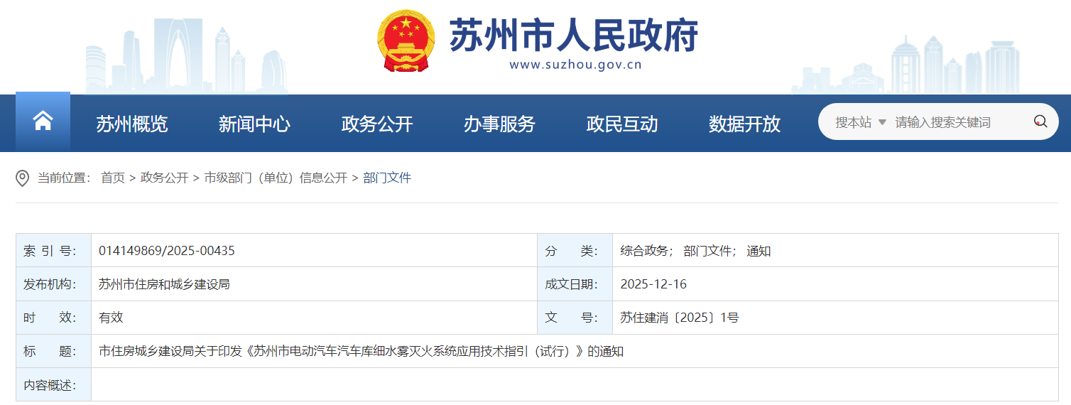 根据前期调研及真火试验数据,我局组织编制了《苏州市电动汽车库细水雾灭火系统应用技术指引(试行)》,现予印发,请各地建设主管部门、各有关单位认真贯彻执行。