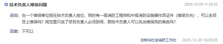 在一个维保单位担任技术负责人岗位,同时有一级消防工程师和中级消防设施操作员证件(维保方向),可以去项目上维保吗?规范里只说了项目负责人必须到场,那技术负责人可以充当维保员的角色吗?