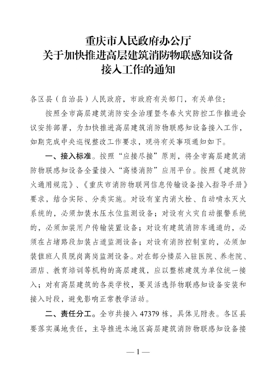 近日,重庆市人民政府办公厅印发《关于加快推进高层建筑消防物联感知设备接入工作的通知》,明确按照"应接尽接"原则,实现全市47379栋高层建筑消防物联感知设备全量接入"高楼消防"应用平台,为城市高层建筑消防安全筑牢科技防线。