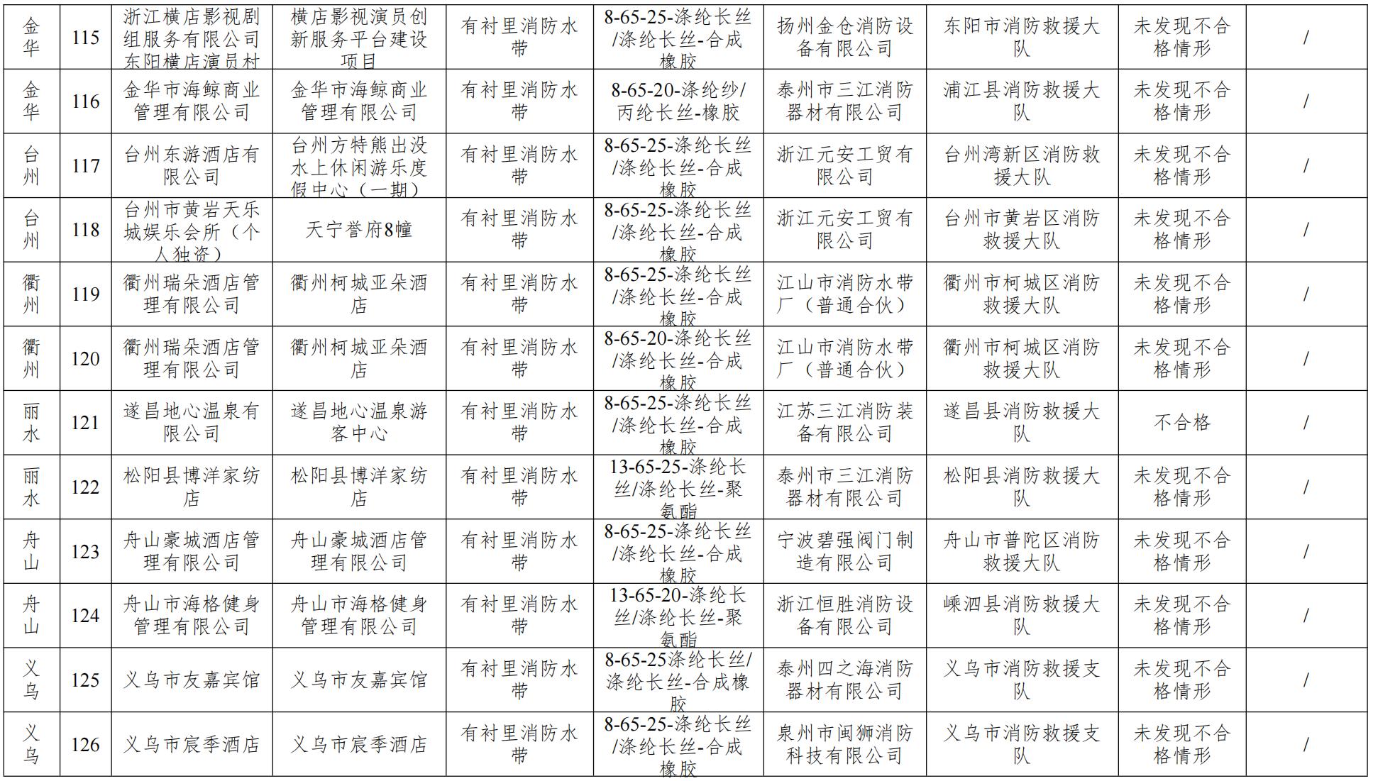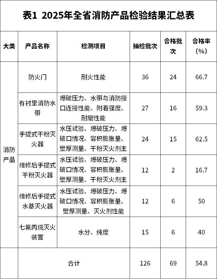 本次监督抽查产品种类包括防火门、有衬里消防水带、手提式干粉灭火器、维修后手提式干粉灭火器、维修后手提式水基灭火器、七氟丙烷灭火剂(灭火系统)共6大类消防产品,共抽检样品126个批次。从检验结果来看(详见表1),消防产品抽查合格69个批次,合格率54.8%。