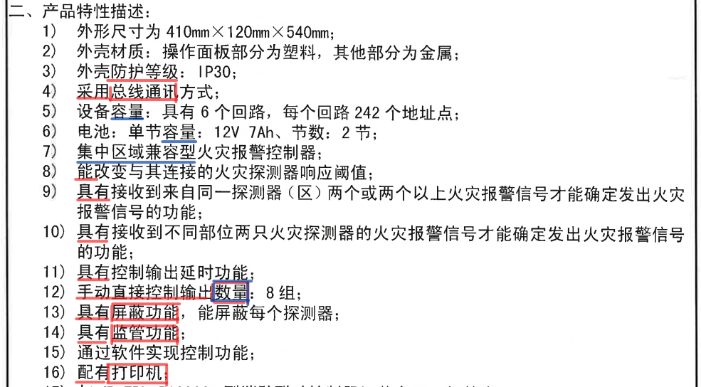注:此产品是火灾报警控制器/消防联动控制器,故“手动直接控制输出”大于5组。只有具有差异性的特性参数(如外形尺寸、防护等级、设备容量、电池节数容量等)才在“产品特性描述”中体现,还有就是可选功能与配置。