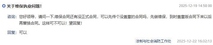 您好领导,请问一下.维保合同还有没正式合同,可以先传个没盖章的合同吗,先做维保,到时盖章版合同下来以后再替换合同。这样可不可以!望回复!