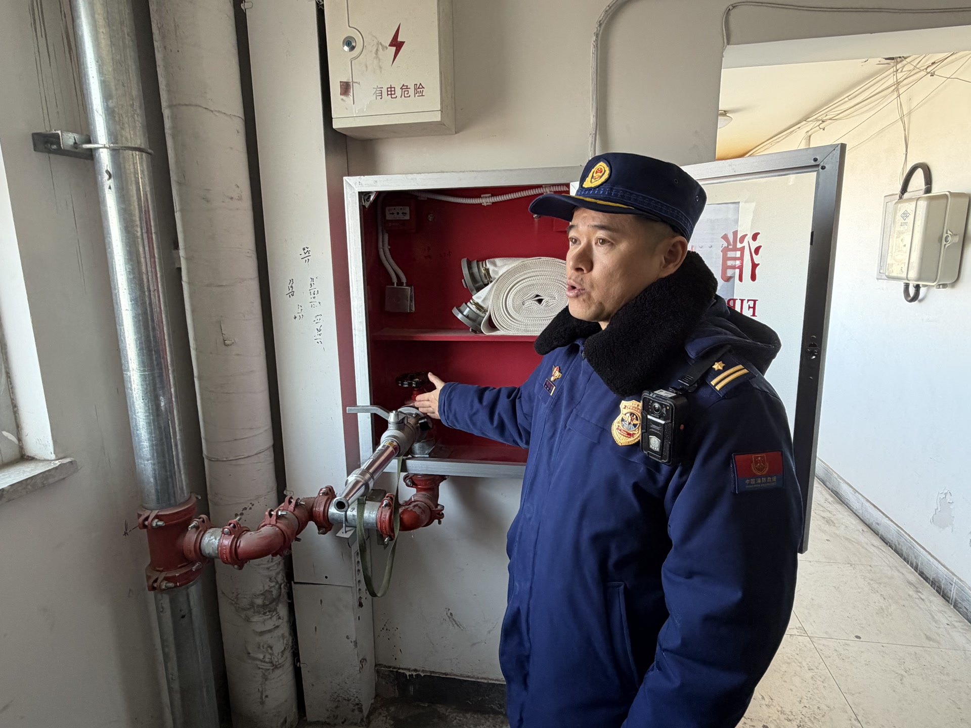 邓春雷向记者介绍新更换的墙壁消火栓及管道。