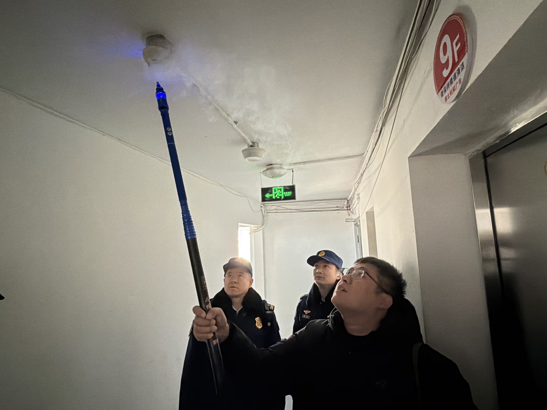 现场测试楼道新安装的烟感报警器。