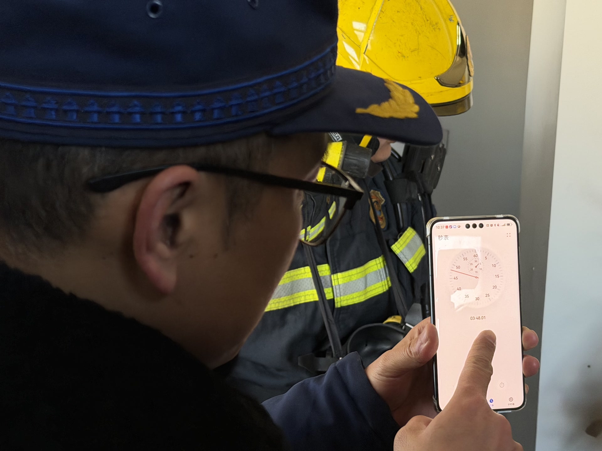 墙壁消火栓无水,消防员们需先连接室外消火栓和消防水罐车,然后携带一盘盘水带,从一层接力铺设,直到10层。3名消防员拼尽全力,用时3分48秒。