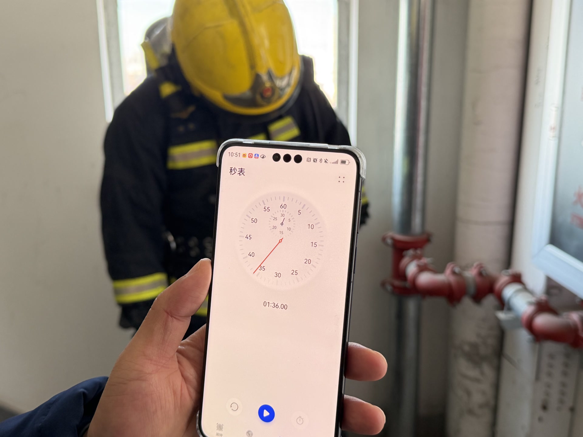 墙壁消火栓有水,消防员则无需一层一层铺设水带,而是直奔9层,从消火栓箱里接出水带后,便能投入到10层的灭火战斗中,用时1分36秒。