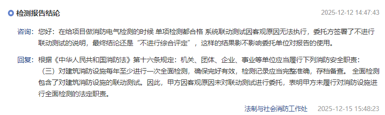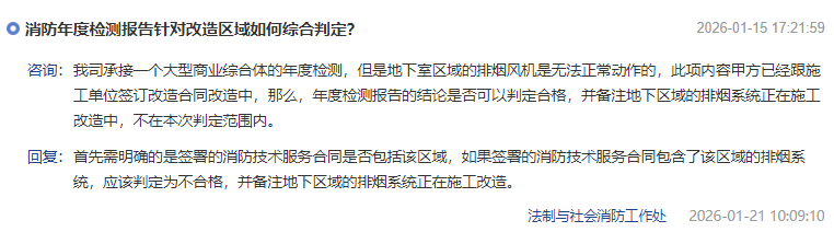 咨询:消防年度检测报告针对改造区域如何综合判定?