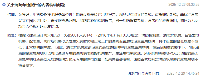 因此,消防水泵房应该设置的是应急照明中的应急备用照明,在满足照度的要求下,可以设置的是应急照明灯也可以通过专用的消防供电回路利用生产、生活用电来实现,所以机构需要明确无此项指的是无应急照明灯还是既无应急照明灯也无专用的供电回路,如果两者都没有,该报告就应判定消防水泵房的应急照明不符合要求。