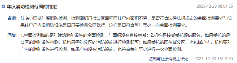 2.机构是接受委托提供服务,如果委托的是公区的消防设施检测,机构只需对公区的消防设施进行检测即可;如果委托的既包括公区,也包括户内,机构要对户内的消防设施进行检测,如果户内没有消防设施,也符合每年至少进行一次全面检测。