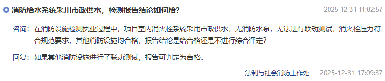咨询:消防给水系统采用市政供水,检测报告结论如何给?