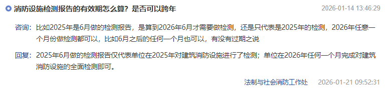 咨询:消防设施检测报告的有效期怎么算?是否可以跨年