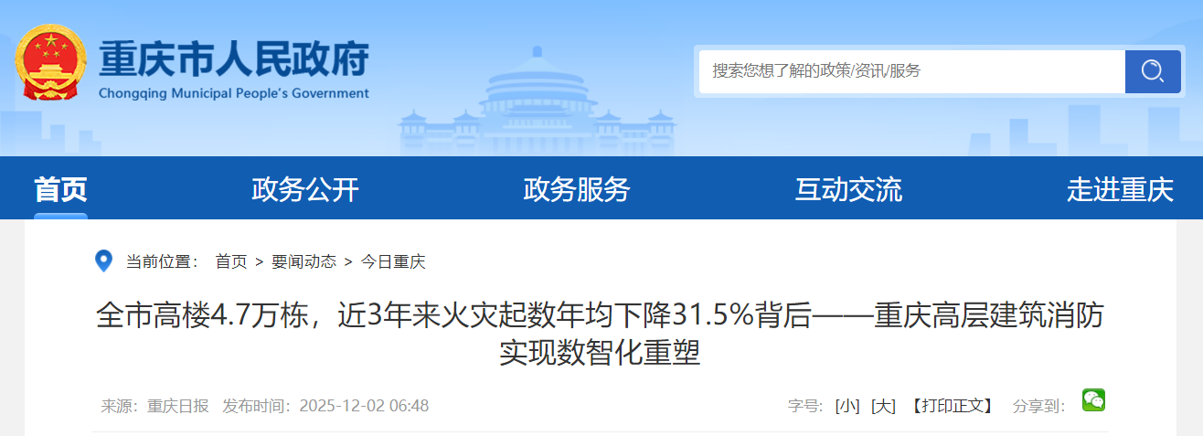 重庆市消防救援局打造的“高楼消防”应用,整合每栋高层建筑基础信息、消防管理情况、消防设施运行状态和灭火救援预案等数据,逐栋形成“高楼消防码”。