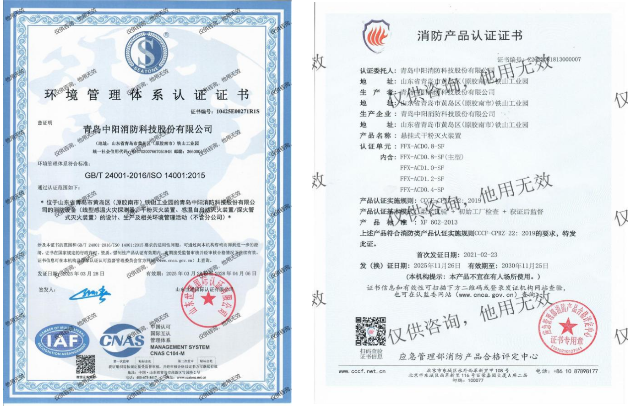 l 严格遵循 XF602-2013《干粉灭火装置》、XF578-2023《超细干粉灭火剂》标准,通过消防认证取得认证证书,质量可靠有保障。