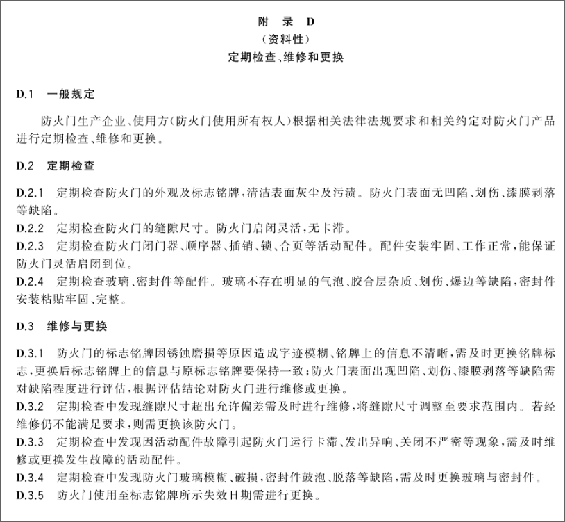 新版附录D明确了防火门的全生命周期维护要求: