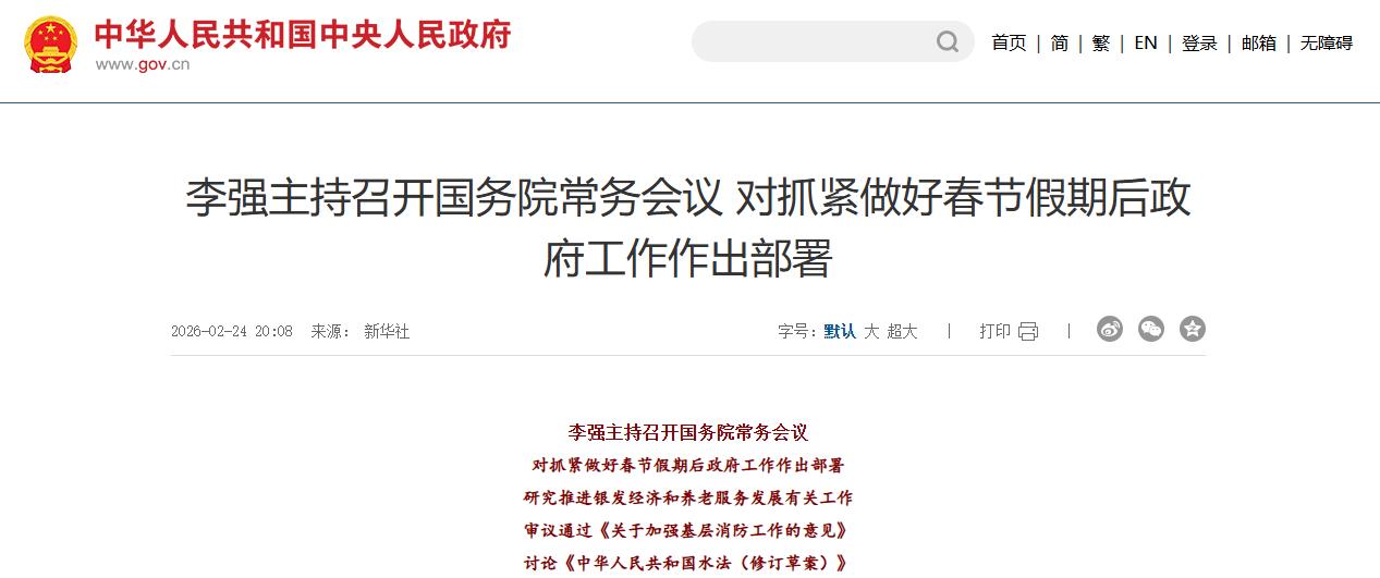 国务院总理李强2月24日主持召开国务院常务会议,对抓紧做好春节假期后政府工作作出部署。会议指出,今年是“十五五”开局之年,国务院各部门要进一步增强责任感紧迫感,瞄准全年目标任务,迅速进入工作状态,推动党中央各项决策部署落地见效。尤其要树立和践行正确政绩观,坚持从实际出发、按规律办事,自觉为人民出政绩、以实干出政绩。要着力抓好重点任务落实,按照职责分工尽快组织力量,深入研究推进工作,确保取得实实在在的成效。要以创新的思路优化管理和服务,支持地方和企业积极探索打造新增长点,多到一线了解企业诉求和群众急难愁盼,拿出更多有针对性的政策措施,不断激发市场活力、增进民生福祉。