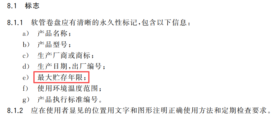 其中8.1.1条明确软管卷盘应永久性标记最大贮存年限。
