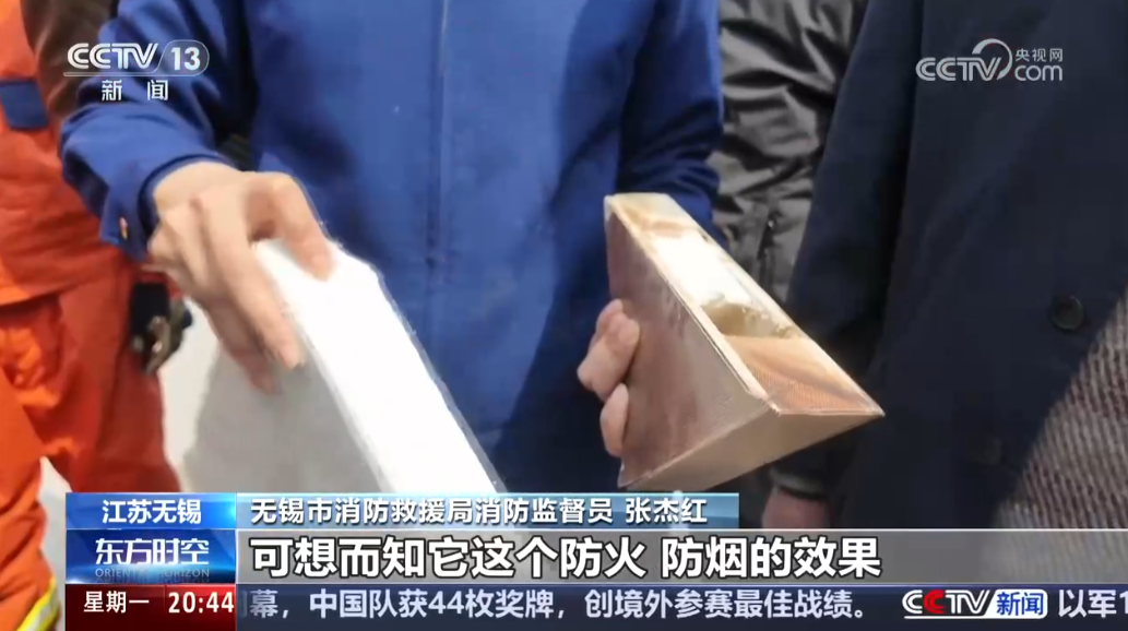 无锡市消防救援局消防监督员张杰红:中间这一层应该是有一层防火板的,然后这个里面呢有一层填充的材料,膨胀的珍珠岩的材料,那么像这个我们刚才切下来的不合格材料一看它填充的都不是很严实,你看用手可能拿都能拿下来,本身材质也比较松散的,可想而知它这个防火、防烟的效果肯定也不行。