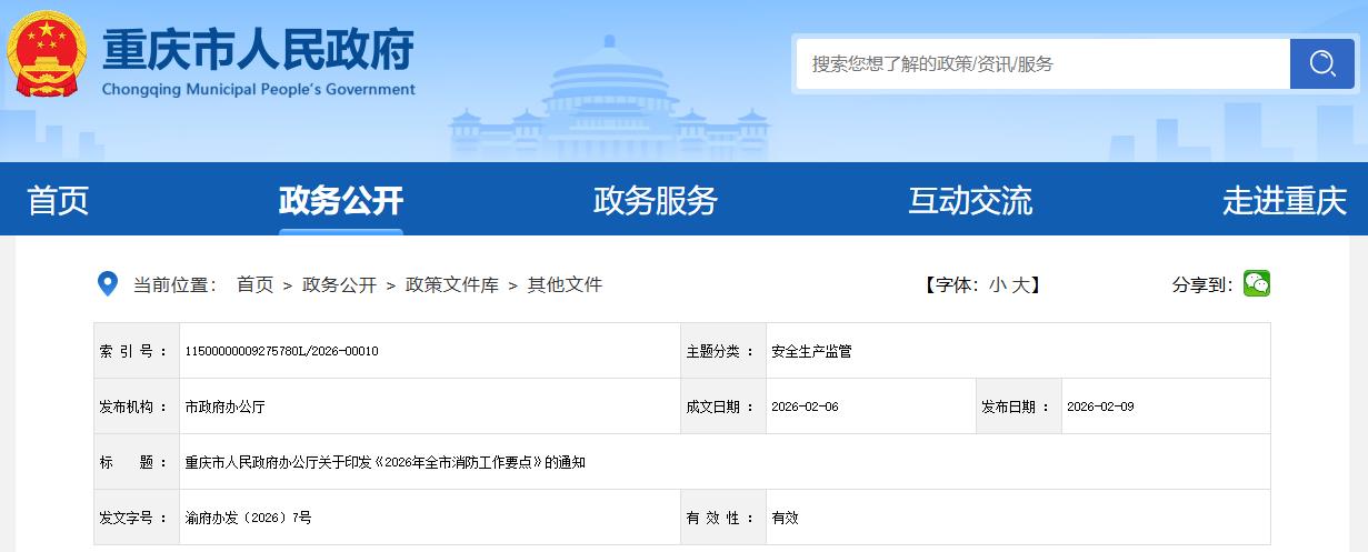 重庆市人民政府办公厅关于印发《2026年全市消防工作要点》的通知