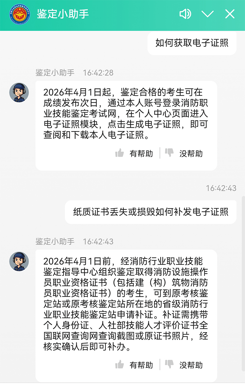 自2026年4月1日起,经消防设施操作员职业技能鉴定合格的人员,同步制发电子证照与纸质证书。考生可在成绩发布次日,登录消防职业技能鉴定考试网本人账户下载和打印电子证照。