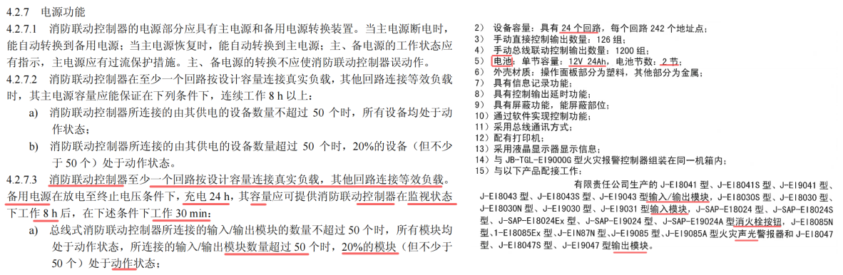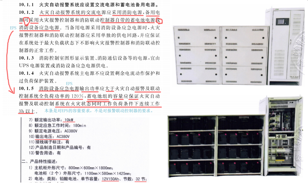 需要注意、正确理解的是10.1.5条中联动状态下连续工作3h以上的规定,是对“消防设备应急电源”EPS(功率几十—上百kW,由几十—几百节大容量电池组提供)容量的要求,不是对联动控制器自带(主机电源)蓄电池容量的要求。