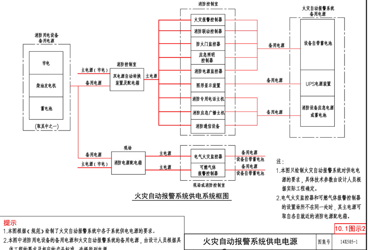 火规图集14X501-1中的系统供电电源图示也可以参考,备用电源:控制器自带蓄电池;消控室图显(CRT)配UPS电源(火规10.1.3条,用词为“宜”);消防应急广播配EPS或蓄电池。
