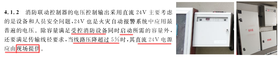 注:现场联动设备如果需要持续供电(额定电压DC 24V),需要考虑电源线末端电压的限制(线路压降),按照火规4.1.2条要求当设备处电压为DC 22.8V以下就需要现场设置消防电源。