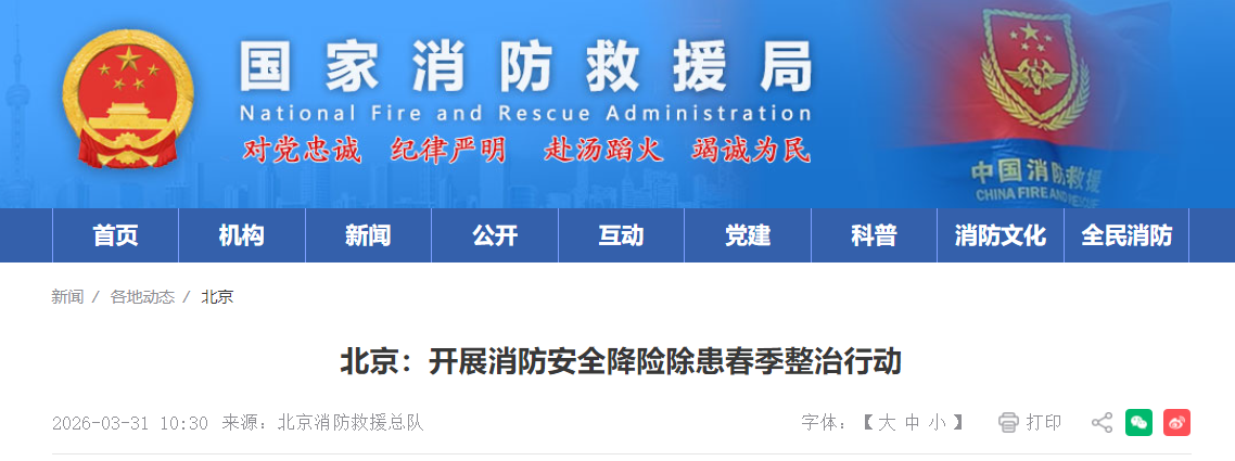 北京市防火委办公室决定,自即日起至6月30日,在全市开展消防安全“降险除患”2026春季整治行动。整治行动将聚焦高危场所、薄弱环节、重点时段,严厉整治火灾隐患,全力压减火灾事故,坚决遏制较大以上和有影响的火灾事故,以高质量消防安全保障首都高质量发展大局。
