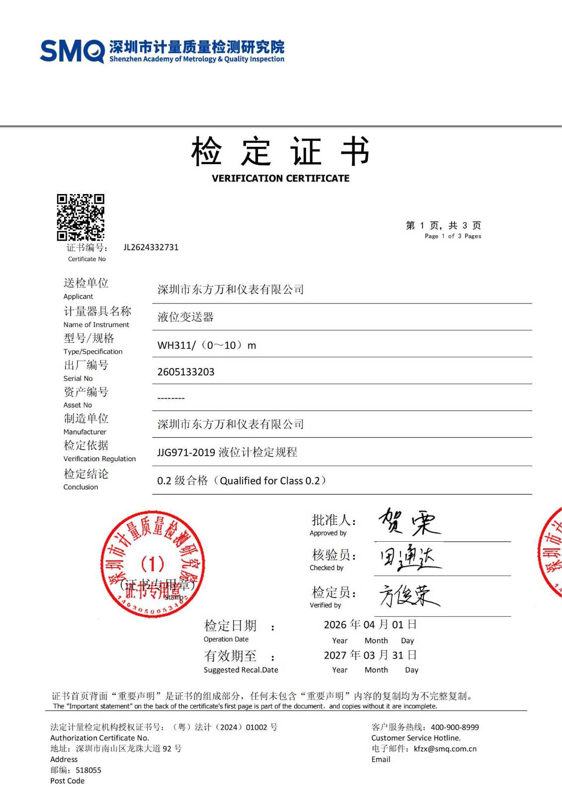 【核心提示】 近日,深圳市东方万和仪表有限公司旗下WH311液位变送器,通过深圳市计量质量检测研究院(SMQ)严格检定,获颁0.2级精度合格证书。检定数据显示,该产品在0-10米全量程范围内,最大示值误差仅0.006mA,回程误差仅0.007mA,实测精度不仅大幅优于国家0.2级标准,更全面超越0.05级精度要求。加之此前获得的国际公认SGS通标认证“双证加持”,WH311以扎实的第三方数据,为行业树立了液位监测的新精度标杆。