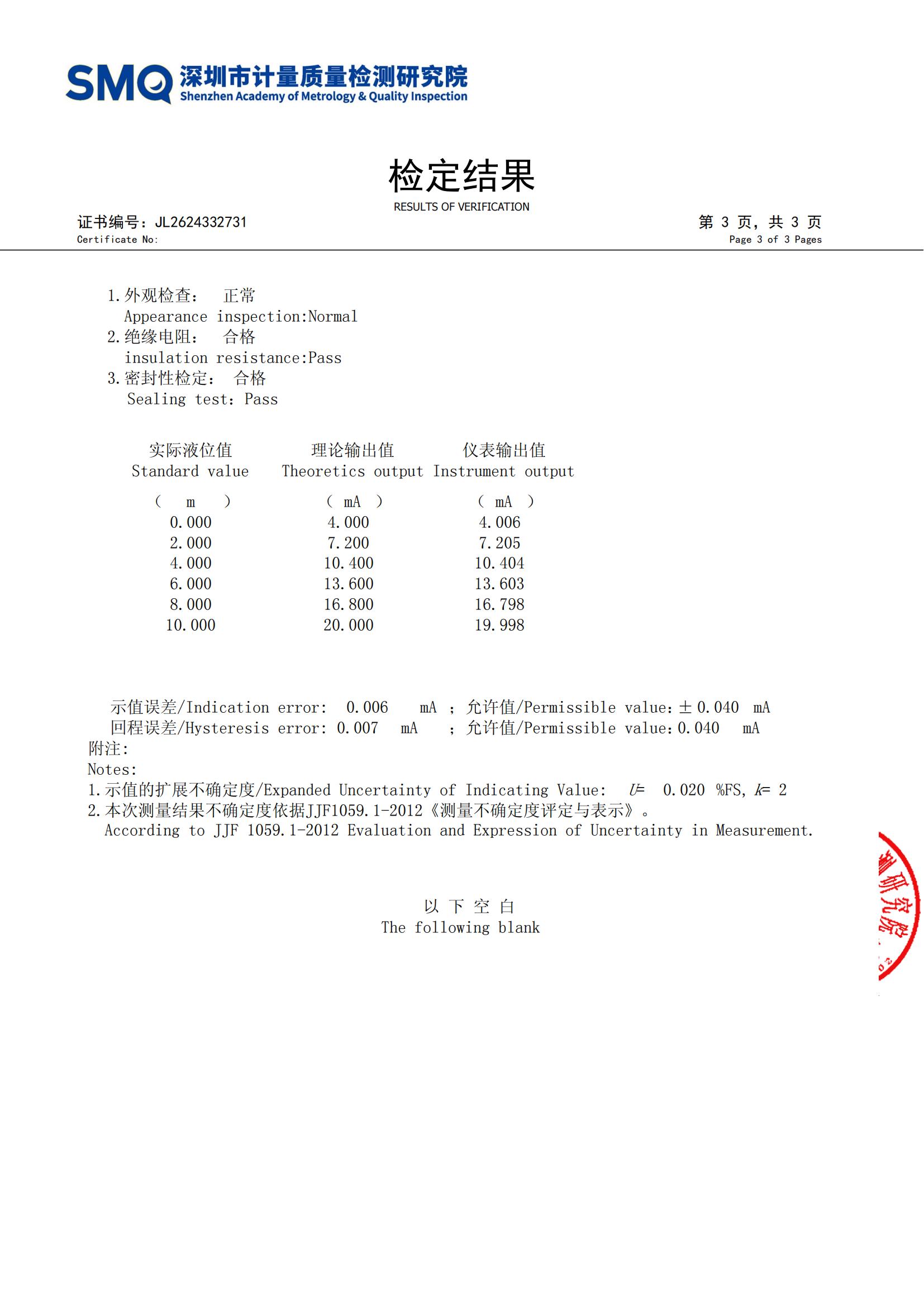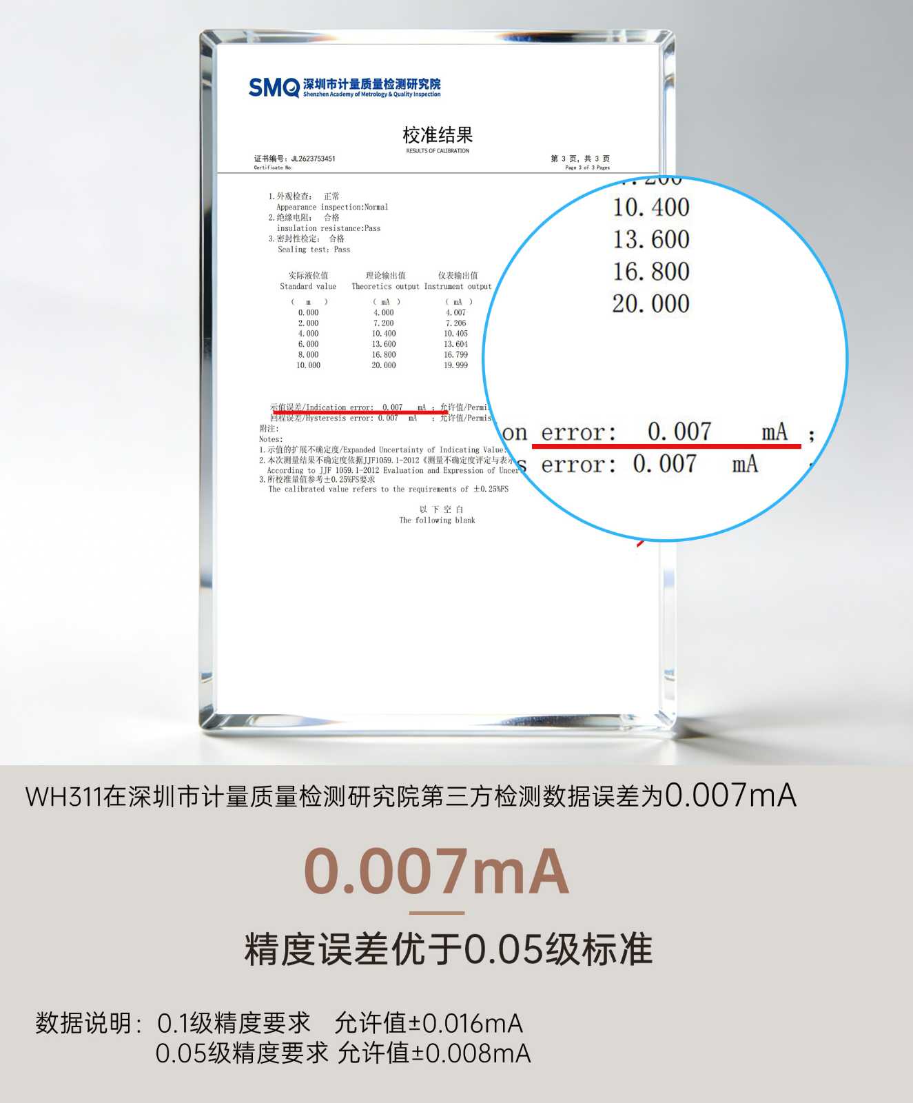 根据深圳市计量质量检测研究院出具的检定证书(证书编号:JL2624332731),检定人员在0m、2m、4m、6m、8m、10m共6个液位点对WH311进行了全量程测试,最大示值误差仅0.006mA,回程误差仅0.007mA。检定结论为:0.2级合格。