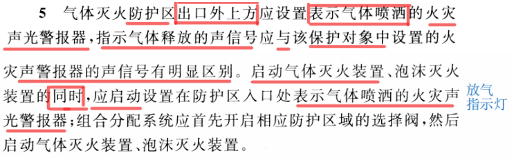 火规中对于“放气指示灯”功能的描述(表示气体喷洒)没有问题,依据产品标准GB 26851是属于声光的一种类型,但理解成普通的声光就不对了。常见的争议点是“放气指示灯”是否必须具有声信号,火规中实际上只提到指示气体释放的声信号要与“火警”声信号区别开,并未提出“放气指示灯”应发出声信号。看一下GB 26851中的规定以及产品“型式检验报告”吧。
