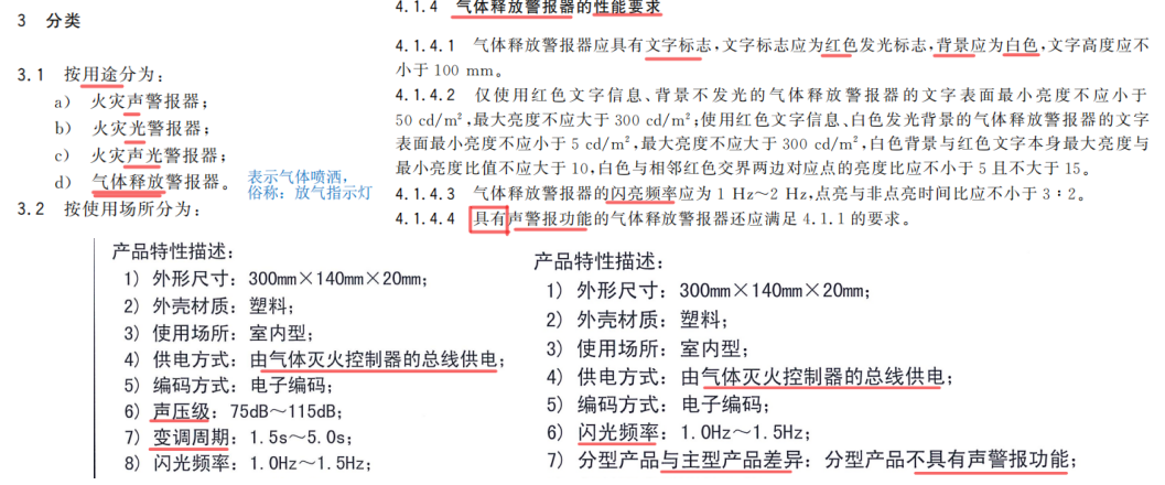 注:标准中要求“具有”即可选功能,上图中分型产品是不具有声警报功能的“气体释放警报器”。工程应用中为保险起见,可以优选采用具有声警报功能的。