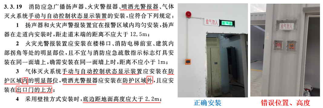 3)施工验收标准GB 50166-2019的规定,产品名称又不一样“喷洒光警报器”,但可以进一步印证声警报功能不是必须的。安装位置、高度很明确:出口门上方、底边距地面2.2m以上。
