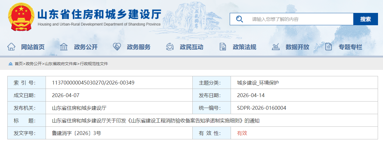 2026年4月14日,山东省住房和城乡建设厅官网发布了关于印发《山东省建设工程消防验收备案告知承诺制实施细则》的通知鲁建消〔2026〕3号,该文件为符合条件的低风险小型建设工程开辟了一条"承诺即备案、材料极简、事后抽查"的快速通道,同时通过5%抽查、15日必检、违诺三年禁入等机制严守安全底线。也明确了可以不需要办理消防审验的三类情况。
