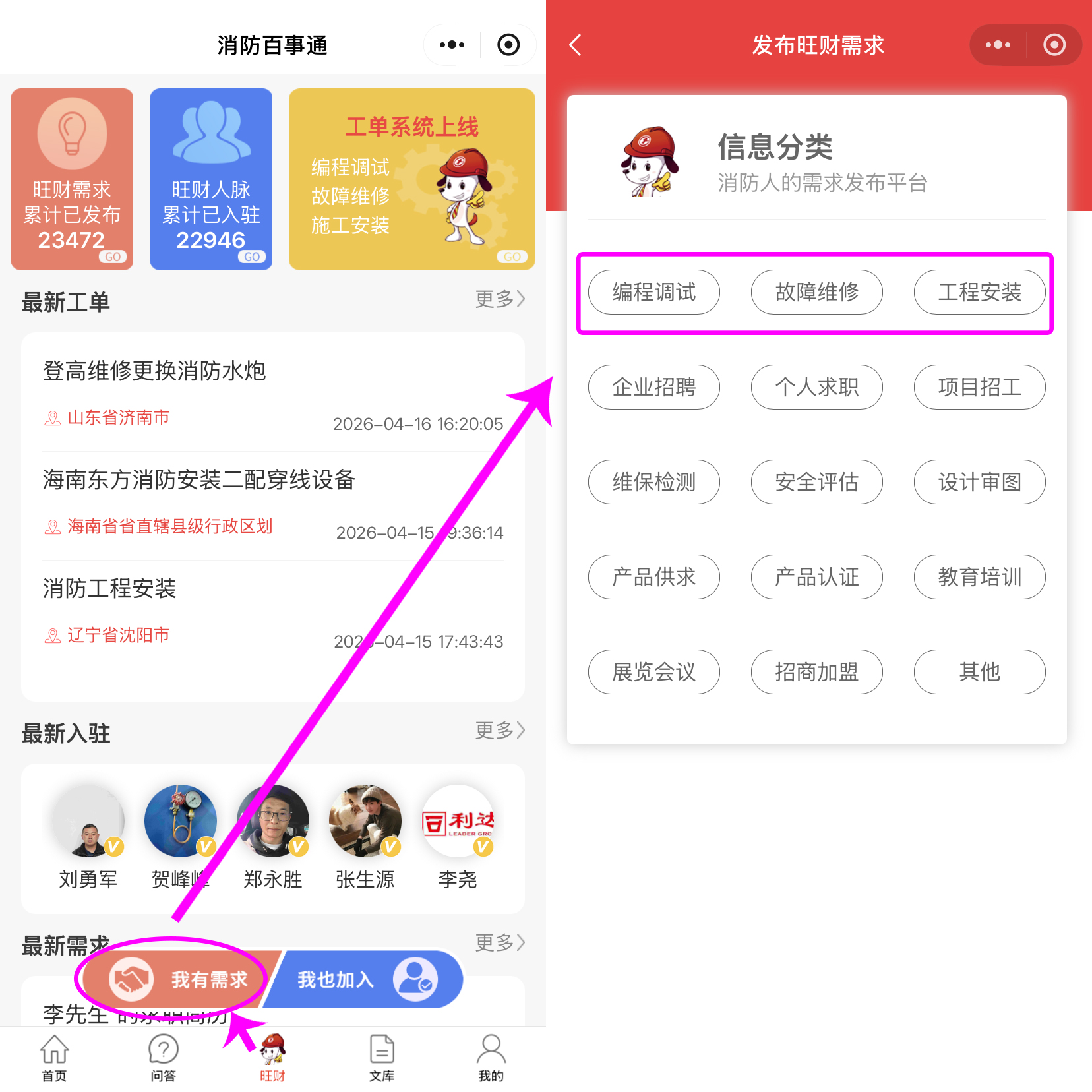 APP渠道:下载消防百事通APP→首页点击旺财→底部“我有需求”→填写信息提交;